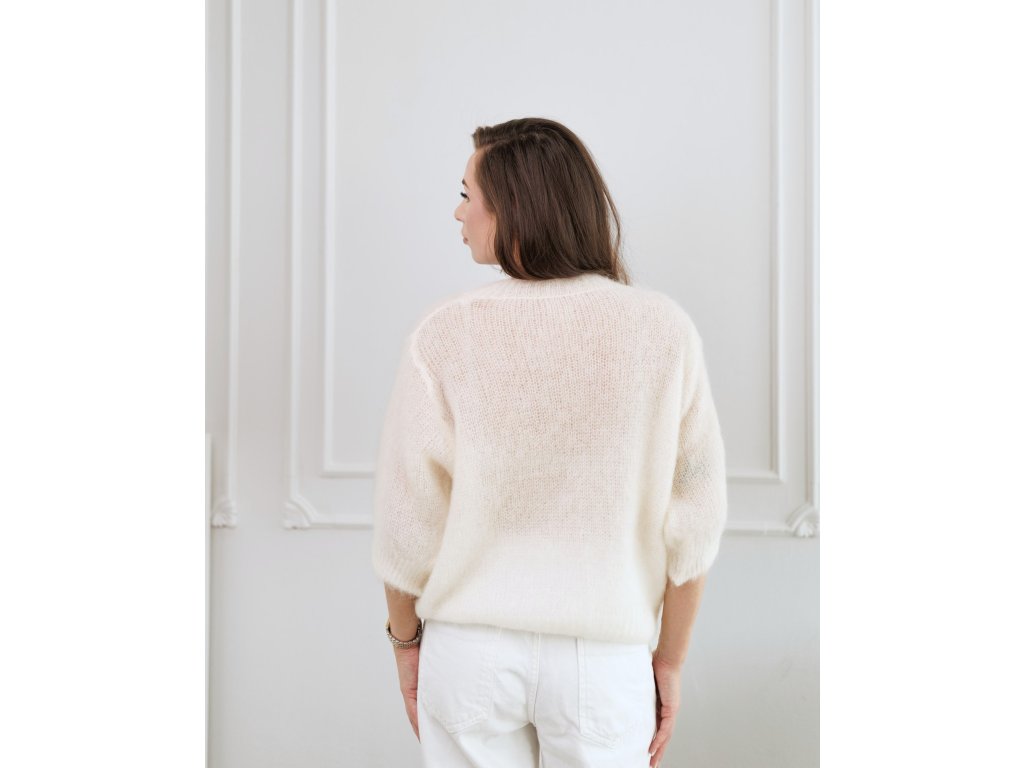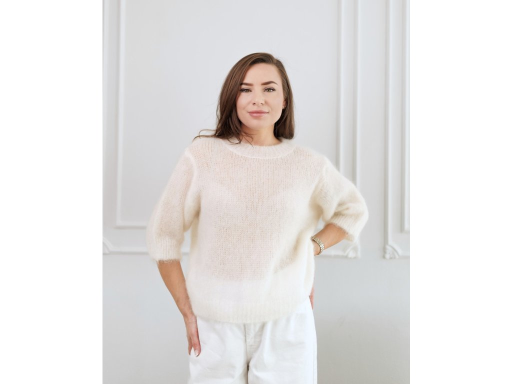 Lehký svetr z kid mohéru s kulatým výstřihem a tříčtvrtečními rukávy.